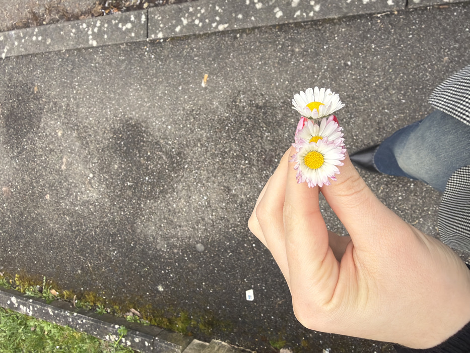 An overhead photograph depicts a human's right hand holding three daisies above a paved surface