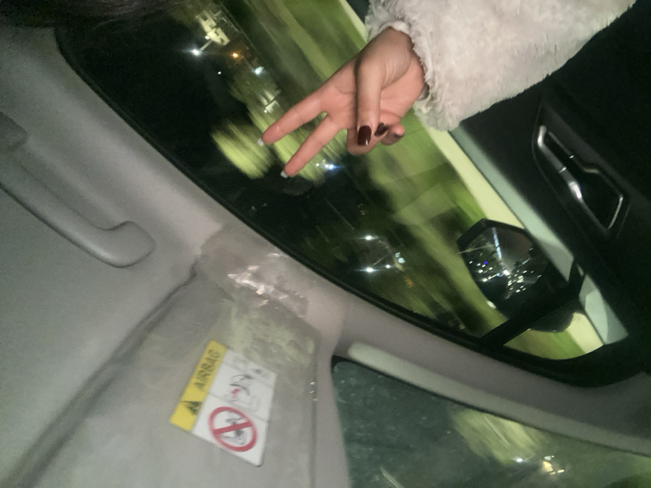 From inside a car at night, a hand flashes a peace sign out the window. The hand has dark red nail polish and is wearing a white, fuzzy sleeve. The car's interior features a gray headliner with a warning label on the sun visor. Outside, blurred lights suggest the car is moving. The side mirror and part of the car door are visible.
