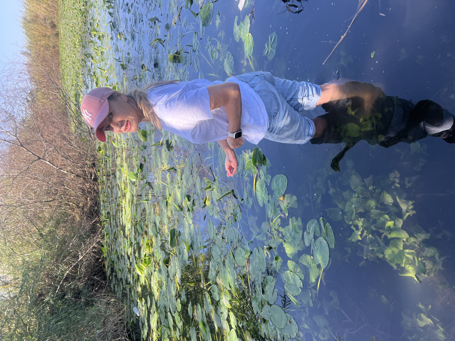 A middle-aged Caucasian female stands immersed up to her mid-shins in a freshwater pond or wetland within the city of Petah Tikva, Israel
