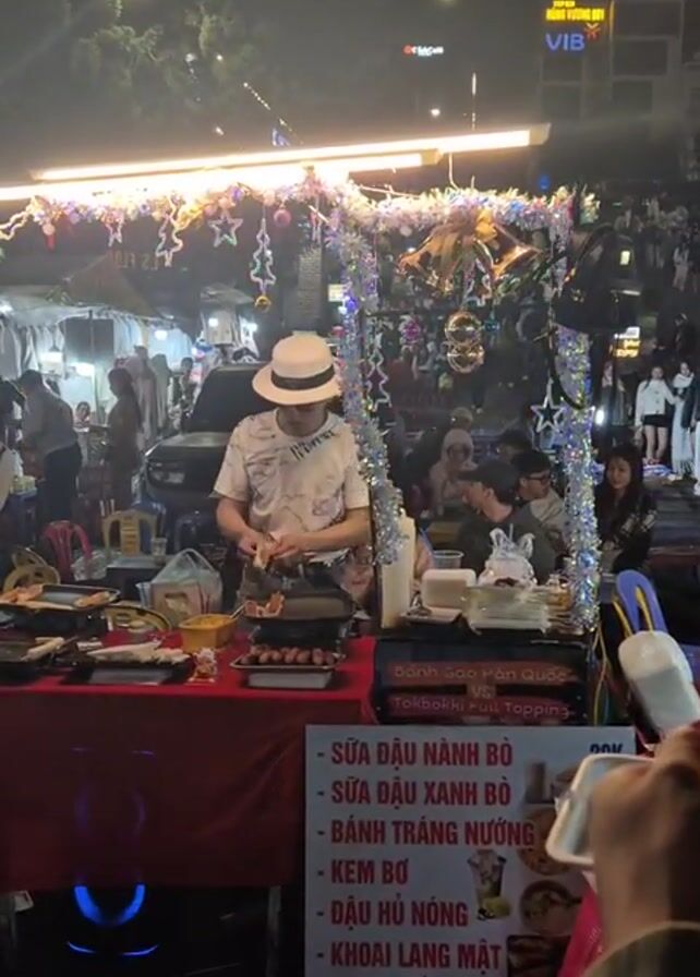 nighttime street food stall in a bustling, festive atmosphere. A man wearing a white fedora and sunglasses is preparing food on a grill behind a red table. The table is decorated with Christmas lights, tinsel, and star-shaped ornaments. A menu in Vietnamese is displayed on the front of the table, listing items like soy milk, green bean milk, grilled rice paper, and other snacks. People are standing around, ordering and eating. Some are sitting at tables near the stall. The background shows more people milling about, illuminated by streetlights and the lights from other shops or stalls. A black SUV is visible behind the stall. The overall impression is a lively street market scene.