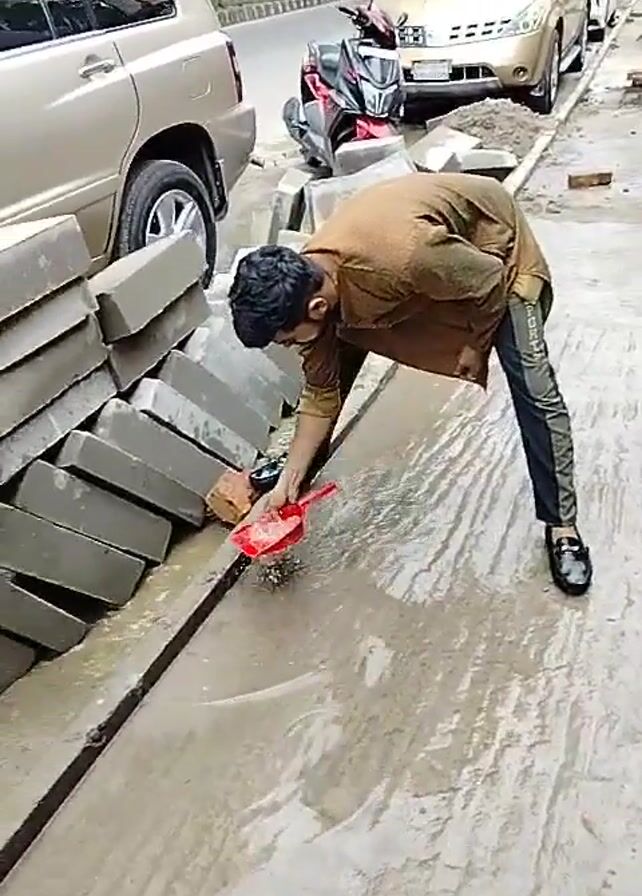 A young man in a brown shirt and dark pants is using a red plastic scoop to clear water from a narrow ditch in a concrete surface. He is bent over, reaching into the ditch with the scoop, next to a stack of concrete blocks on one side. Behind him are several parked vehicles, including a gold SUV and a red scooter. The area appears to be a street or roadside under construction. There is water spread over the concrete surface, suggesting recent rain or flooding.