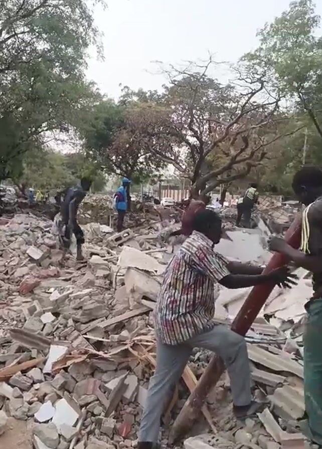 group of people working to clear debris from a collapsed structure. The environment is outdoors, possibly a construction or demolition site, as evidenced by the piles of rubble and the presence of trees. People are walking around and through the debris, and several are working together to lift and carry a long, red pipe. The debris consists of concrete blocks, bricks, wood, and other building materials. The sky appears overcast, suggesting a dull or cloudy day.
