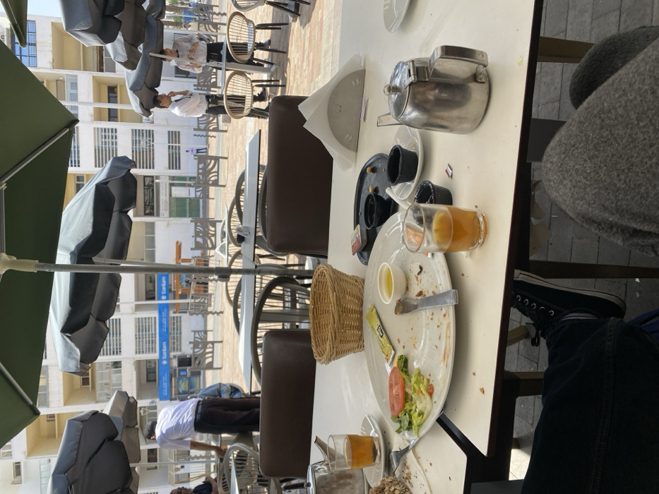 close-up view of a table with a half-eaten meal at a cafe in Agadir, Morocco (coordinates 30