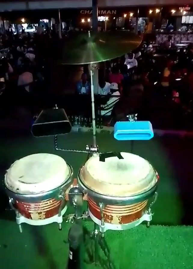 set of small bongos on a green platform, a cymbal, and percussion instruments. A microphone stands in front of the bongos. The camera pans to show a crowd of people seated at tables in an outdoor dining area at night. There is a lighted sign with the word "Chairman" visible in the background. The area is well-lit.