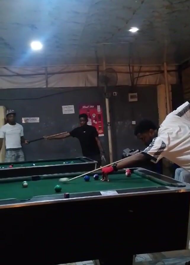Three men are playing pool in what looks like a casual billiards hall