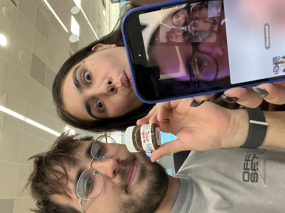 An image taken in a brightly lit indoor retail or public space, likely within the Capital City of Prague, Czechia. Two individuals, a male and a female, are depicted in a selfie-style composition. The male, positioned on the left, has light brown hair, a beard, wears round-frame glasses, and a grey t-shirt. He holds a small jar of Nutella in his right hand, clearly displaying the label with "60Kč". A dark grey fabric watch band is visible on his left wrist. The female, on the right, has dark hair and a playful expression, characterized by wide eyes and pursed lips. She holds a blue-cased smartphone in her right hand, the screen of which displays a paused video feed and a reflection of both individuals along with the Nutella jar. The background is blurred, showing overhead grid lighting and subtle hints of blue-lit retail shelving or displays.