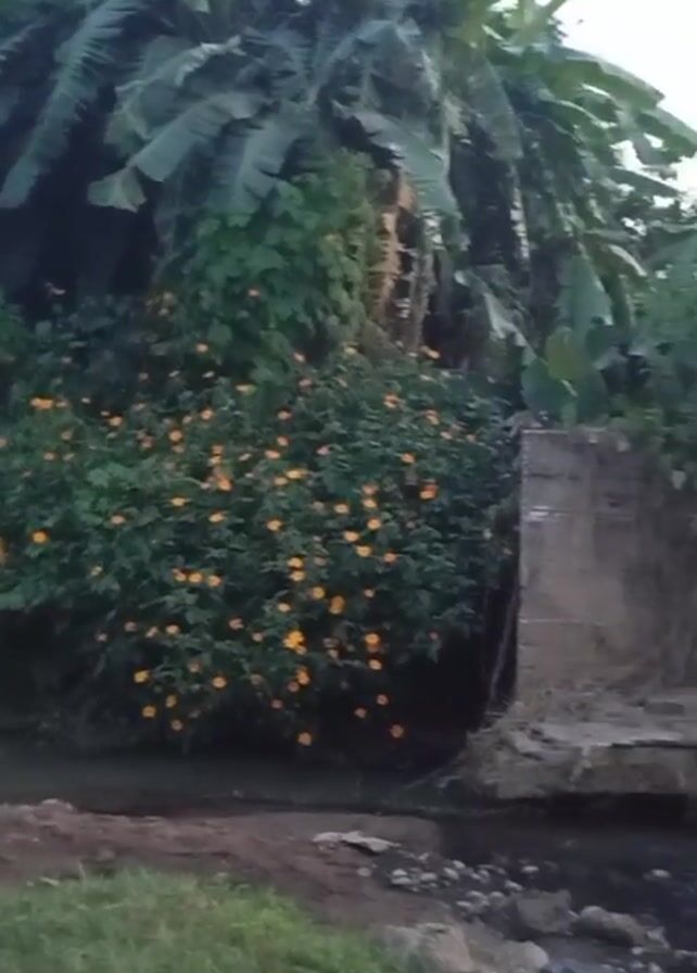 The video pans along a water channel bordered by lush vegetation. A large banana tree and a bush with numerous small yellow flowers dominate the left side of the frame. A concrete structure is situated on the right bank, seemingly bridging the channel. As the camera moves, the water reflects the overcast sky. The scene darkens, revealing the silhouette of a house atop a ridge in the background.