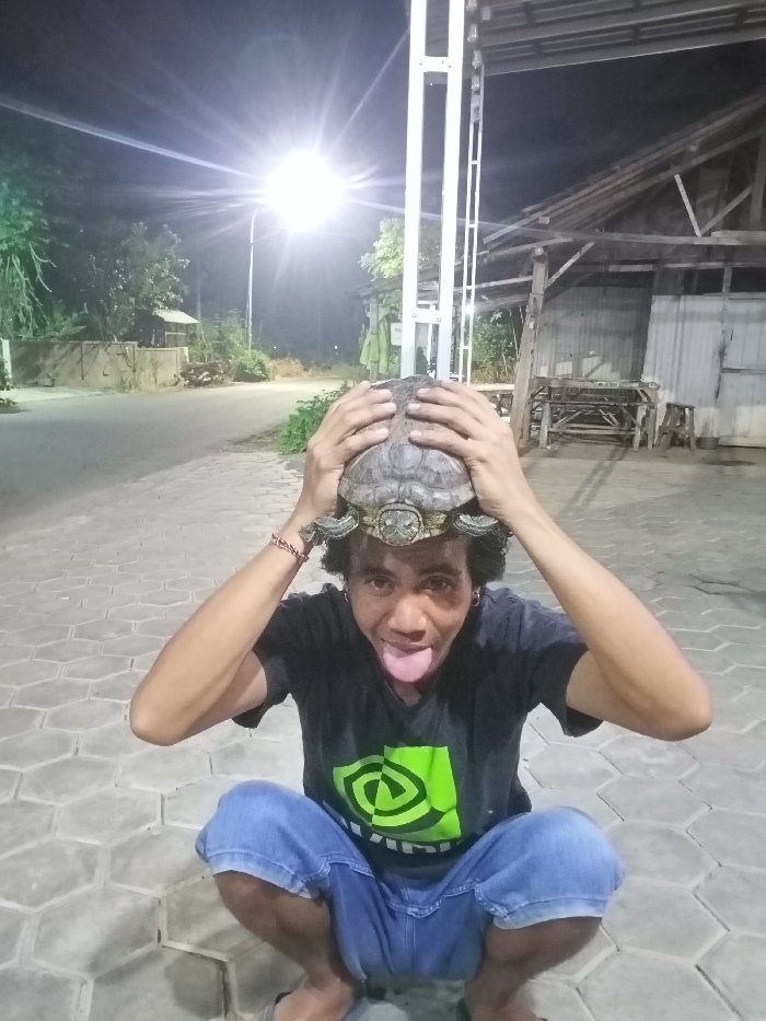 At night in Ketowan, Indonesia, a male individual is captured in a medium shot, squatting outdoors on a paved surface composed of hexagonal blocks. He is positioned centrally, facing the viewer with his tongue extended. His dark, curly hair frames a face with dark eyes, and he wears a dark t-shirt featuring a prominent green graphic, blue denim shorts, and dark footwear. A braided bracelet adorns his right wrist, and earrings are visible in both ears. His hands are placed on the carapace of a live freshwater turtle, which rests on his head, facing forward. The turtle's patterned shell and head are visible, positioned above a decorative headpiece the individual wears. The background shows an asphalt road curving to the left, illuminated by a brilliant street light on a pole. Dense foliage and a distant structure are visible further down the road. To the right, a white metallic support structure stands adjacent to a wooden building with an A-frame roof, beneath which wooden tables and benches are arranged. The scene is brightly lit by the overhead street lamp, casting defined shadows.