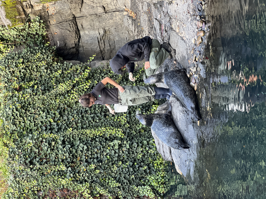 Two people stand near the water's edge with three seals resting on a rock. One person wears a black hooded sweatshirt and khaki pants, while the other wears a dark gray shirt and khaki pants. The seals are gray with dark spots. Lush green ivy covers a stone wall to the left. The water reflects the scene. The overall environment appears natural and rocky.