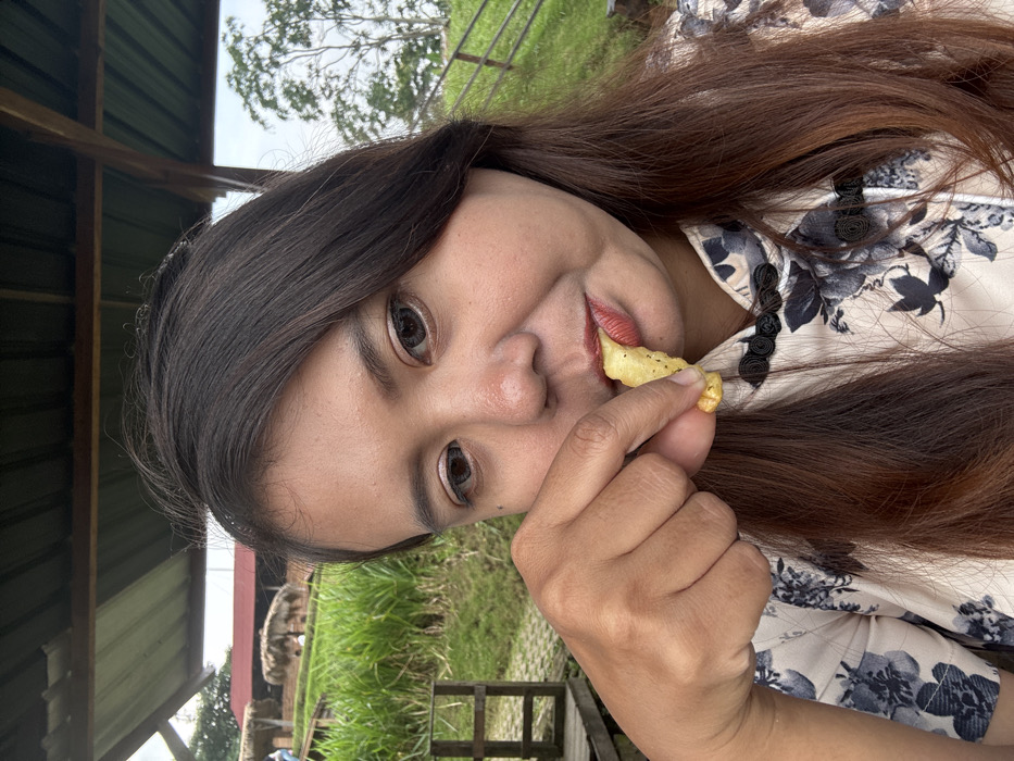 A woman of Asian descent, captured in a mid-shot, is seen eating a light yellow, irregularly shaped snack, possibly a fried item with dark specks, which she holds to her lips with her right hand. Her mouth is partially open, consuming the snack. She has long, dark brown hair, and wears a light-colored top with a dark floral pattern and traditional frog closures on the collar. The immediate environment is an outdoor, covered area with a dark green corrugated metal roof supported by wooden beams visible overhead. In the background, to the subject's left, green foliage, including tall grass or crops, is prominent, with a wooden railing in the mid-ground. Further back, a red-roofed building and a structure with a thatched roof are visible on an elevated grassy slope, with indistinct figures nearby. To the subject's right, more green foliage, a wooden fence, and a tree are visible against a light sky. The scene is located in Tamiajeng, Indonesia.