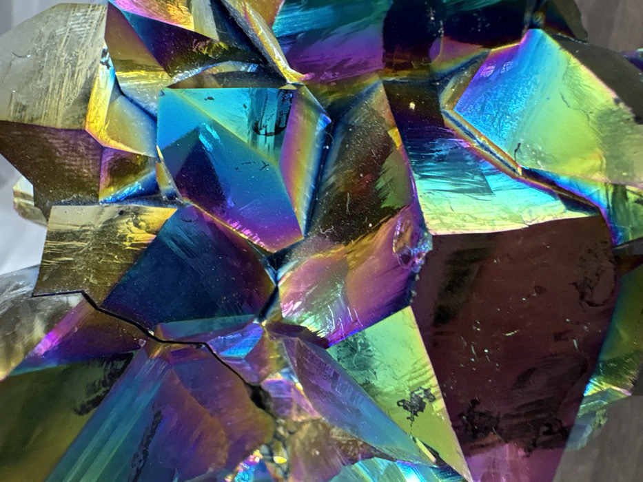 A close-up image showcases a cluster of iridescent crystals. The crystals display a rainbow of colors, including blues, purples, greens, and yellows, reflecting light and creating a shimmering effect. The sharp, angular edges of the crystals form a complex, geometric pattern, with visible cracks and imperfections adding to their unique character. The overall texture appears to be both rough and smooth.