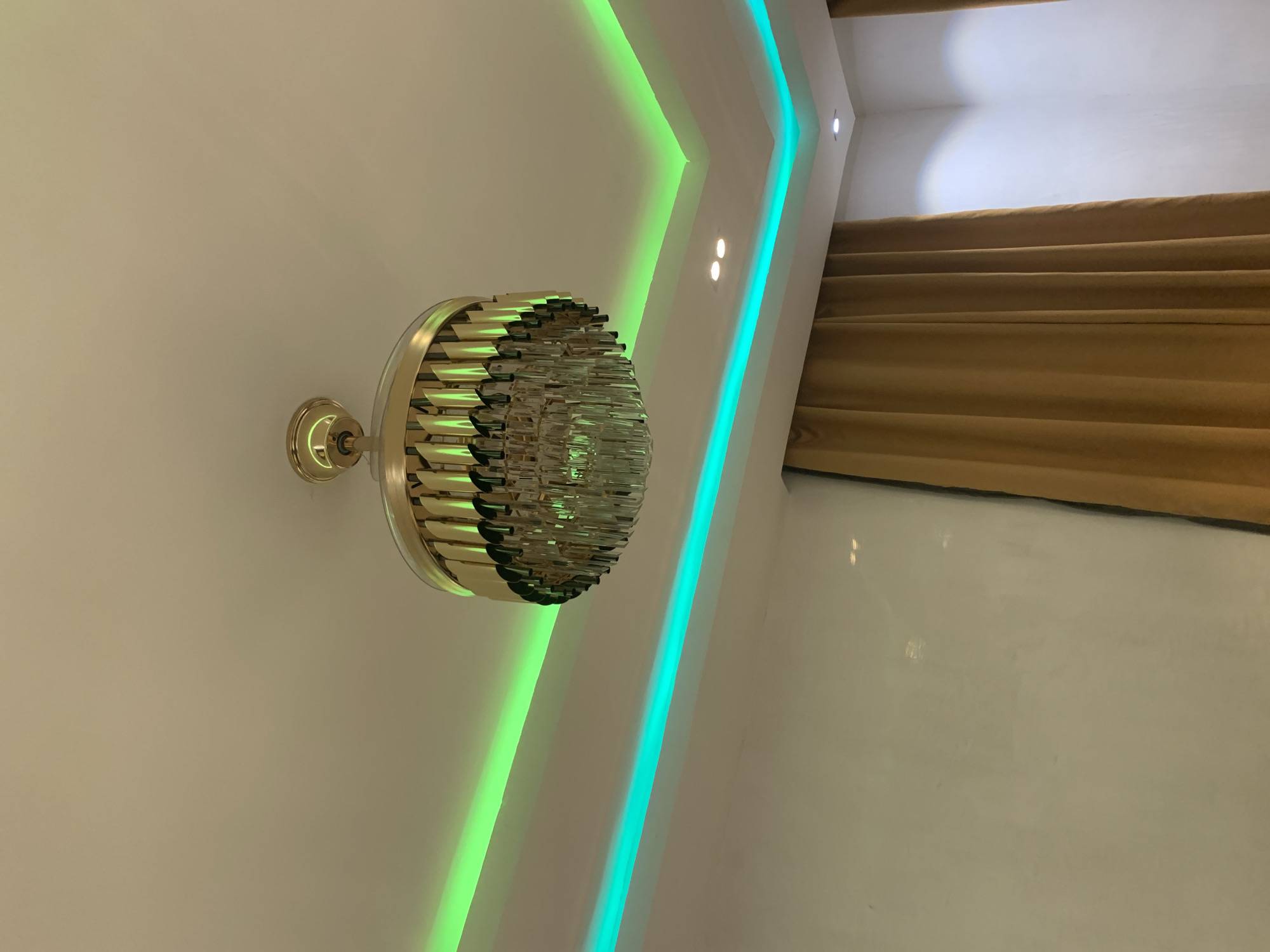 An interior scene is depicted, located in Jos, Nigeria. The view focuses on a white ceiling featuring a central, cylindrical chandelier with a gold-toned frame and clear, vertically suspended rod elements. The ceiling's perimeter is illuminated by recessed cove lighting, displaying distinct green and teal-blue linear strips. Two circular recessed spotlights are also visible on the white ceiling. A white wall occupies the lower-left portion of the frame, while pleated, light brown curtains hang vertically along the lower-right side. No individuals or active subjects are present.