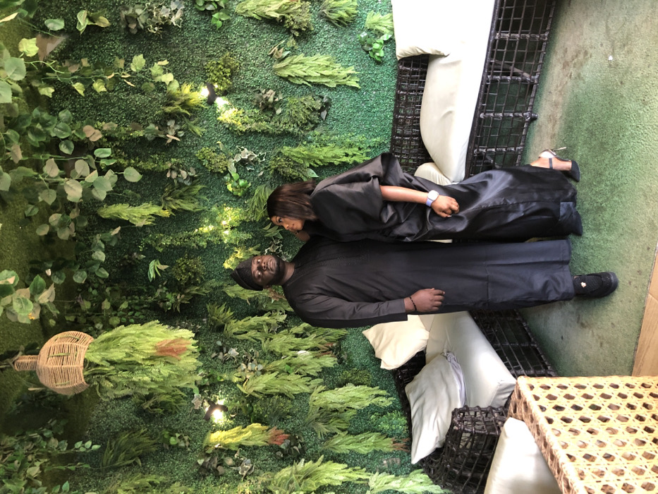 This image depicts two individuals, an adult male and an adult female, standing in what appears to be an indoor or semi-outdoor lounge area