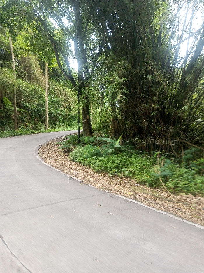 This image depicts a winding, grey paved road in Sarwahi Mal., India. The road curves from the lower-left foreground towards the upper-center, then gently to the right. A white or light-colored edge line runs along the right side of the pavement. Immediately adjacent to the road's right edge, a strip of dried leaves and organic debris is visible, separating the road from dense, green undergrowth. To the right of the road, beyond the undergrowth, a prominent and dense cluster of tall bamboo stalks rises, characterized by numerous green leaves. Further into the background on the right, several large trees with extensive green canopies are present. A low, light-colored, metallic or wire fence is partially visible amidst the undergrowth directly in front of the bamboo cluster. On the left side of the road, the terrain slopes upward, covered with a thick expanse of green foliage and additional trees. Two slender, light-colored utility poles stand upright on this vegetated incline. Sunlight filters through the dense tree canopy from above, illuminating parts of the foliage. No individuals or animals are present, and no discernible actions or interactions are depicted. The scene is characterized by dense tropical or subtropical vegetation under natural daylight conditions.
