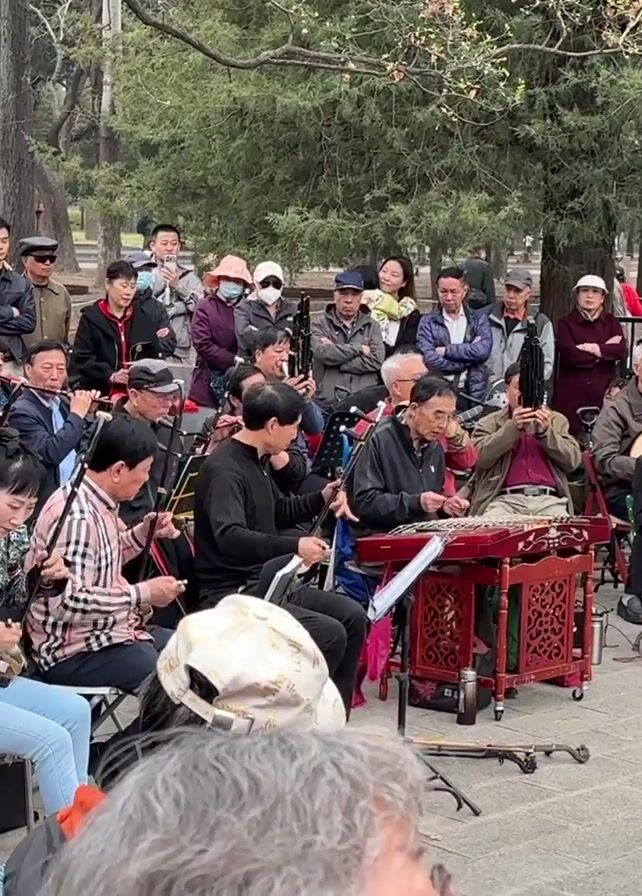 A group of musicians is playing outdoors for an audience, seated in a semi-circle on folding chairs. The ensemble includes instruments such as the erhu, flute, guzheng, pipa, and yueqin. Most of the musicians are middle-aged or older men, with one young woman in an ornate jacket among them. They are all focusing on their instruments and sheet music. The audience is a large group of mostly elderly people, standing or sitting, and many are recording the performance on their phones. The setting appears to be a park, with trees and other people visible in the background.