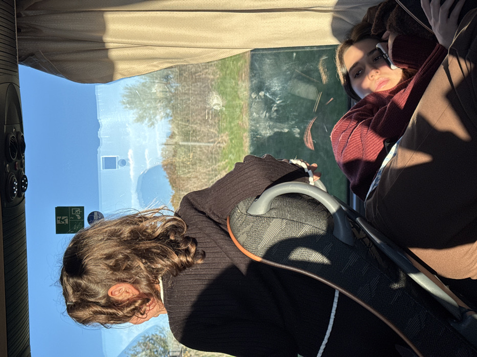 The scene depicts the interior of a passenger bus or coach, located in Ladispoli, Italy, during daylight hours. Two females are present. The first individual, viewed from behind in the foreground, has curly dark brown hair and wears a black ribbed long-sleeved top with white trim on the cuffs and hem. She is seated, looking out the window towards the right. The second individual is positioned in the mid-ground, lying prone across a seat, facing the viewer. She wears a maroon ribbed long-sleeved top and brown pants, and holds a white smartphone with her left hand near her face. Bright sunlight illuminates the interior, casting prominent shadows from the dark grey patterned seats, which feature orange piping and grey plastic handles. An overhead panel with circular vents and lights is visible. Through the large window, a clear blue sky, green and brown vegetation, and a fence are discernible in the background. Safety pictograms, including a green 'exit' sign, are affixed to the window.