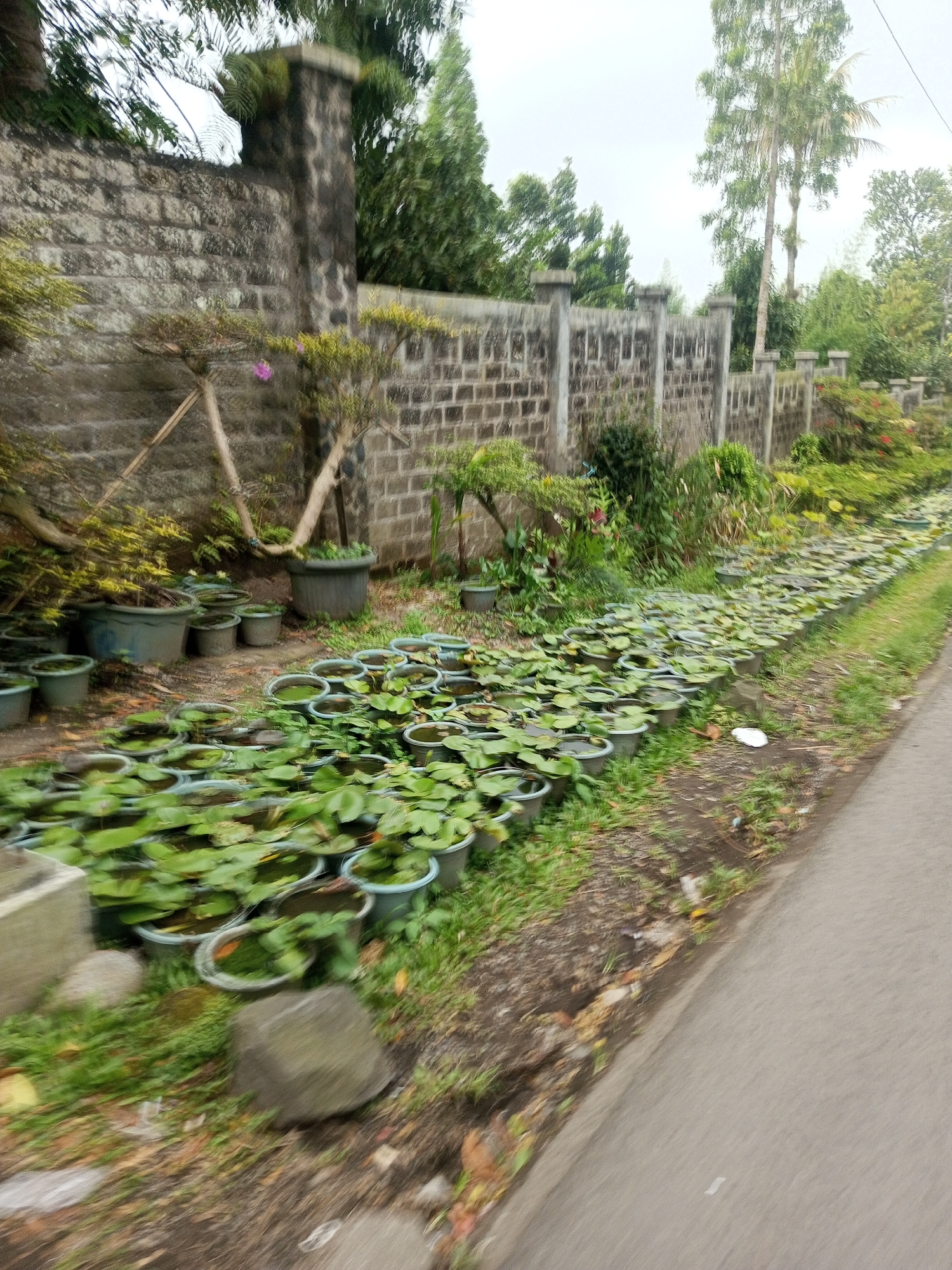 The image depicts a roadside scene in Kan Beit, Myanmar, under overcast conditions. A paved road or path occupies the right side of the frame, bordered on the left by a strip of unkempt soil and sparse green grass. Numerous grey-colored pots, each containing water and green lily pads, are arranged in a long, dense row parallel to the road, extending from the foreground into the background. Behind these potted aquatic plants, a weathered concrete block wall, intermittently interrupted by darker support pillars, forms a boundary. Various green foliage and trees, including a tall palm tree, are visible above and behind the wall. A small, multi-stemmed tree with a single purple flower is visible to the left, partially supported by wooden stakes leaning against the wall. A large, dark, irregular rock is positioned on the ground in the foreground to the left of the potted plants. No individuals are present.