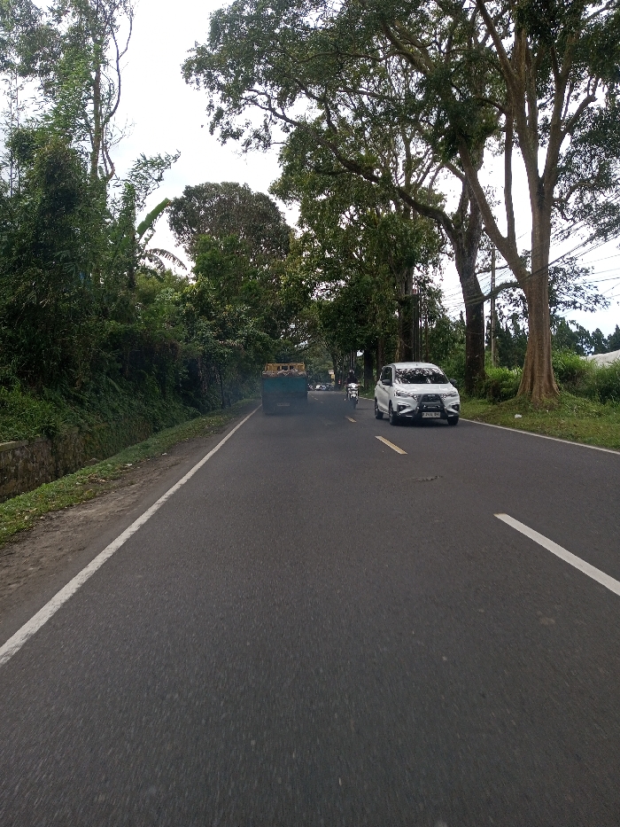 The image depicts a rural or semi-rural paved road scene, presumably within the city of Tagtse Tashidingkha, Bhutan, under an overcast sky. The viewpoint is from a low angle on the asphalt surface, looking forward along the road. In the immediate foreground, the dark asphalt road is visible, marked by a solid white line defining its left edge and a broken yellow line indicating the center of the road or a lane division. In the midground, three vehicles are observed moving away from the viewer in the same direction. On the left side of the road, a dark-colored dump truck or similar heavy vehicle is emitting a visible plume of dark exhaust smoke from its rear. To its right, in what appears to be the right lane, a white multi-purpose vehicle (MPV) or SUV is positioned closer to the viewer. The rear license plate of this white vehicle displays "P 2104 BKU". Partially visible between the truck and the white MPV, a motorcycle is also heading away. The left side of the road is bordered by a low stone retaining wall, behind which dense green foliage and tall trees form a thick, overgrown embankment. On the right side of the road, a grassy shoulder gives way to a line of large trees with prominent, textured trunks and full green canopies. Utility lines, possibly power or communication, are visible running through the trees on the right. In the background, the road recedes into the distance, flanked by continuous dense vegetation and trees on both sides. The sky above is uniformly overcast, indicating a cloudy or hazy day. No people are distinctly visible.