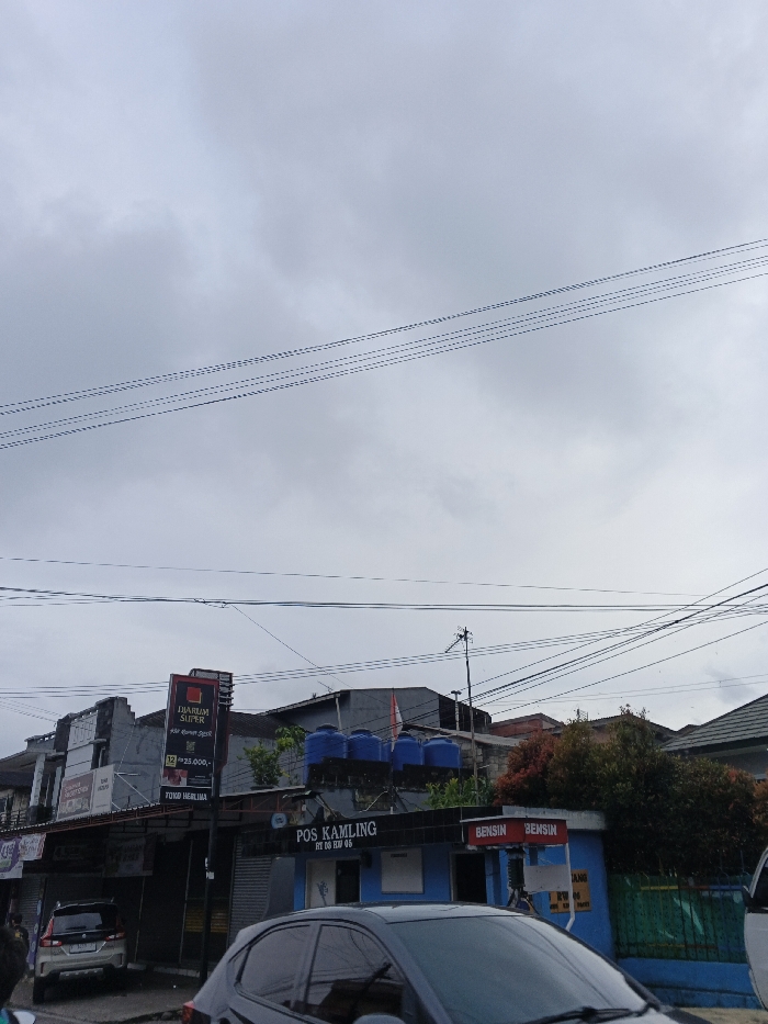 The image captures a street scene under an overcast sky in an urban or suburban setting, identified as Indonesia by prominent text on signage. In the left midground, a multi-story commercial building displays a large red advertisement for "DIARUM SUPER" cigarettes, indicating a price of "Rp25.000,-", and a sign for "TOKO HERLINA." A light-colored SUV is parked in front of this building. To the right, a blue single-story structure, labeled "POS KAMPLING RT 01 RW 06" (a community security post), features four blue water tanks on its roof. Adjacent to the blue building, a small informal fuel stall with "BENSIN" (gasoline) signage is visible. An Indonesian flag (red and white) is mounted on a pole above the buildings. Numerous dark utility wires crisscross the upper portion of the frame against the gray sky. A dark-colored vehicle occupies the lower right foreground, partially obscuring the view. Dense foliage and additional buildings are present in the background. No people are distinctly visible.
