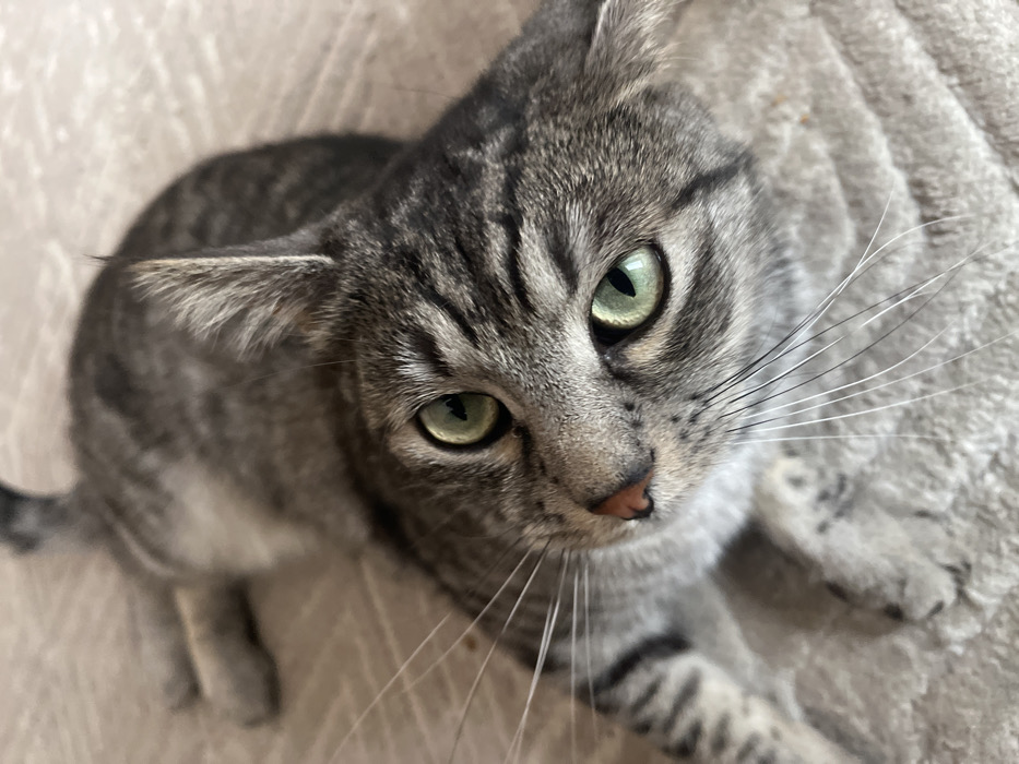 - "A high-angle, close-up photograph captures a domestic short-haired cat, identified by its grey and black tabby markings, lying on a light-colored, textured surface" by FM-5gWWV2, licensed under CC BY 4.0