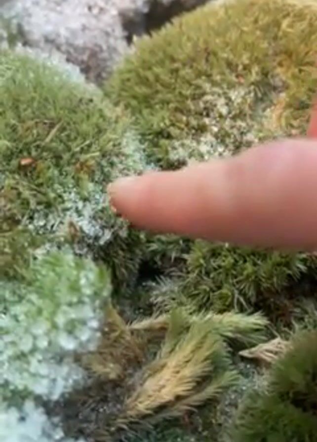 A close-up shot shows several clumps of moss, varying in shades of green, interspersed with patches of what appears to be frost or a white crystalline substance. A finger gently pokes at one of the green moss clumps, revealing the texture of the moss and the distribution of the white material on its surface. The composition gives a sense of a miniature, wintry landscape.