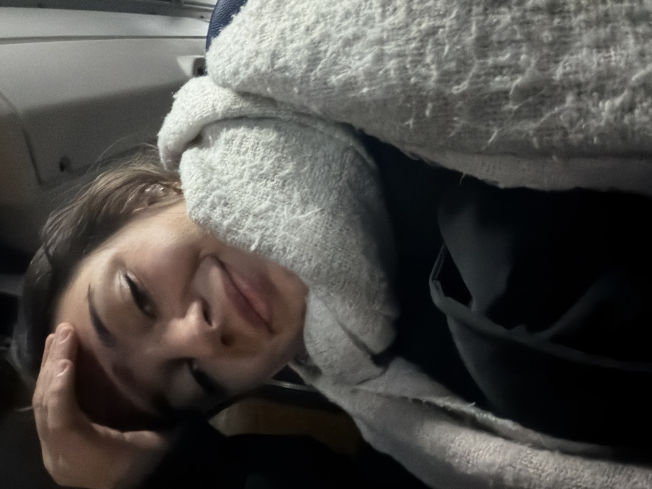 A person's face, eyes closed, is partially obscured by a fuzzy white blanket. The individual's head rests on their hand, and the background suggests they might be in a vehicle, possibly a car or plane. The blanket is wrapped around the person, indicating comfort or sleep. The lighting is subdued, adding to the sense of rest.