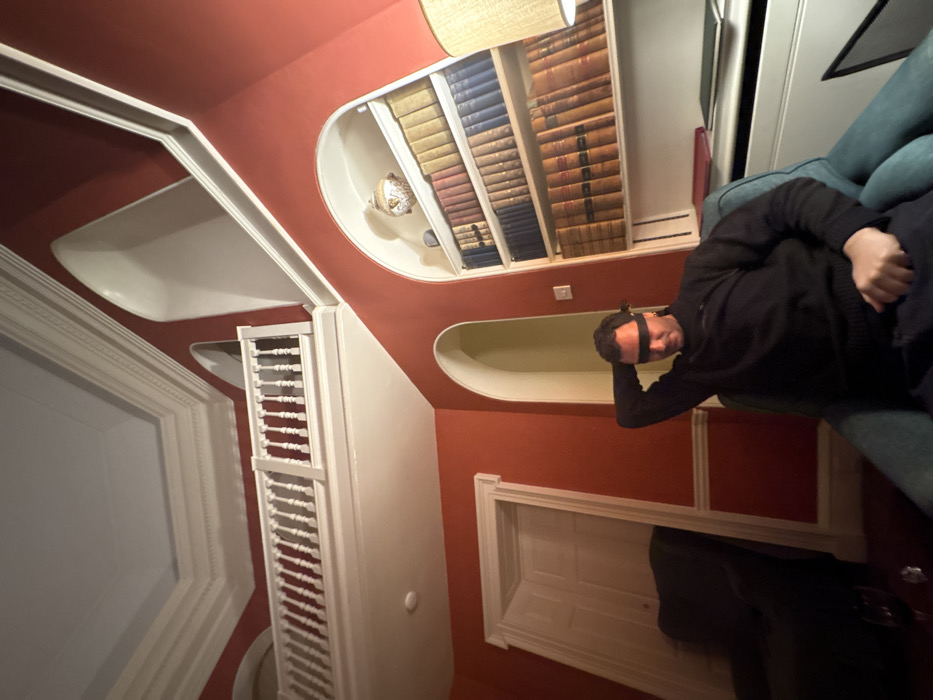 An interior view is rotated counterclockwise. A man in black rests on a turquoise couch, located in the upper right. Above him, a shelf is filled with books. To the left, a staircase is visible, with a white balustrade. Below the man and to the left, a white door frame and interior wall are present, creating a mirror-like reflection on the floor. The walls are painted a salmon color, and there are recessed shelves and arched doorways.
