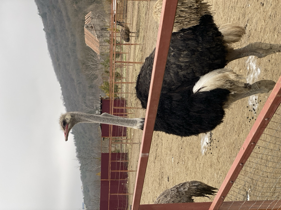- "An adult common ostrich, characterized by black body feathers, white wing and tail plumes, a long grey neck, and a reddish beak, stands prominently in the foreground, facing left" by FM-uK62y1, licensed under CC BY 4.0