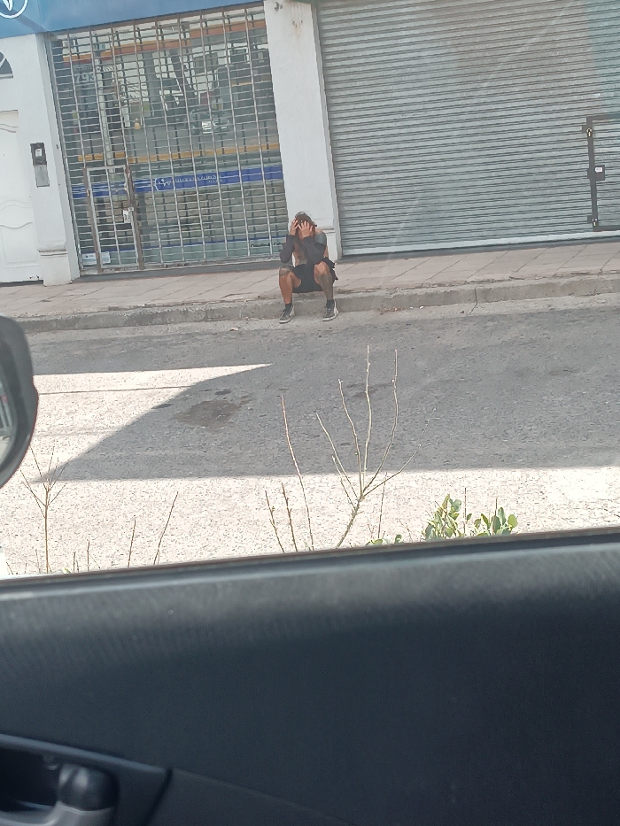 A seated person with their head in their hands sits on a curb between a building with a barred window and a closed roll-up door. They are dressed in dark shorts and a long-sleeved dark shirt. The person is facing away from the viewer and appears to be distressed. The photograph is taken from inside a car with the door panel visible at the bottom. The scene is viewed through a dry, weed-filled patch.