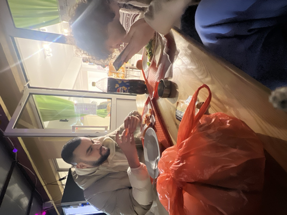 Two individuals are seated at a wooden table within a casual eatery in Sofia, Bulgaria. The male on the left, wearing a beige puffy jacket, has a dark beard and short hair, and is focused on manipulating a food item with both hands. In front of him is an empty white plate and other food items, possibly pastries, on a red plastic tray. To his right, a second individual with curly dark hair is partially visible, dressed in a light-colored top and blue trousers, intently looking at and interacting with a smartphone held in both hands. A plate of food, possibly a salad or wrap, is on a red plastic tray in front of this person. Between the two subjects on the table, a large plastic bottle of Pepsi, an ashtray containing cigarette butts, and a small, crumpled white packet are visible. An orange plastic bag, tied at the top, rests in the immediate foreground on the left. A small orange fruit is also present on the right individual's tray. Through a glass door or window in the background, a brightly lit interior room is visible, featuring white walls, green curtains on either side of an opening, and overhead light fixtures. Cyrillic text, partially legible as "ОРИГИНАЛНО И" (Original and), is discernible on a sign within this background room. The lighting in the immediate area of the subjects is dimmer compared to the background room. A dark object, possibly a refrigerator or display unit, is partially visible on the far left.