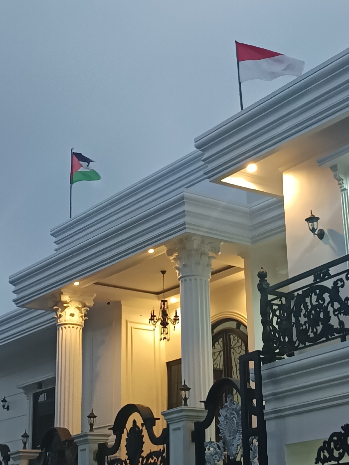 This image depicts a section of a large, ornate building situated in Sindangasih, Indonesia, under twilight or nocturnal conditions. The structure features white or light-colored facades with classical architectural elements, including fluted columns topped with Corinthian capitals, supporting a decorative entablature and roofline. Two national flags are displayed on flagpoles positioned on the roof. On the left, the Palestinian flag, consisting of black, white, and green horizontal stripes with a red triangle at the hoist, is visible. On the right, the Indonesian flag, with red over white horizontal stripes, is present. Both flags are partially unfurled. The building's entrance area is illuminated by multiple artificial light sources. Warm-toned recessed lights are embedded within the ceiling of the portico, and several dark-colored, decorative wall sconces are mounted on the facade. A multi-armed, dark-toned chandelier with dangling elements hangs from the center of the portico ceiling. A black security camera is mounted on the portico ceiling above one of the columns. In the foreground, an ornate black metal gate or fence, characterized by intricate scrollwork, partially obscures the lower portion of the building. A decorative black metal balustrade is visible on the right side of the image, suggesting an upper-level balcony or terrace. The sky above is a uniform light gray, indicative of dusk or an overcast evening. No individuals are visible in the scene.