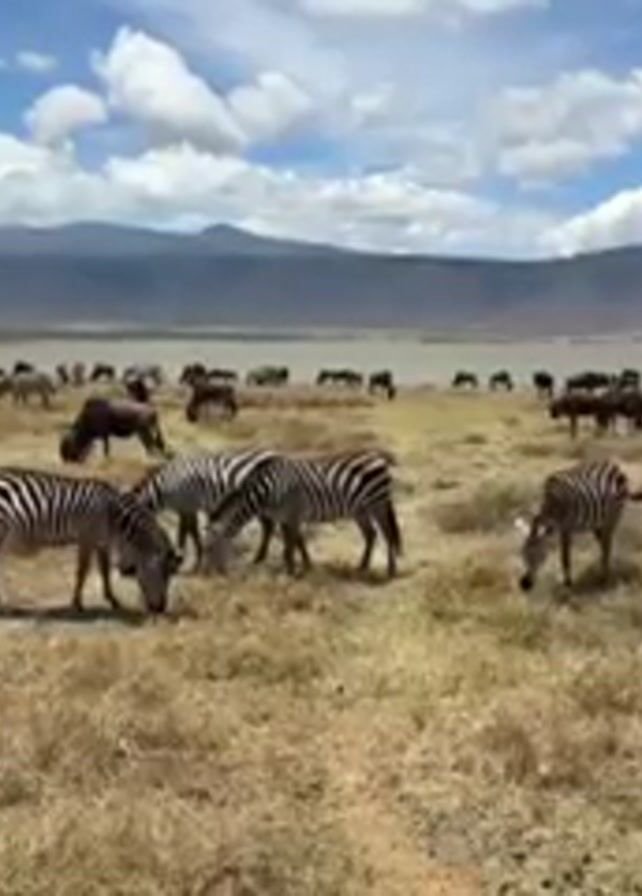 large, dry, grassy field with many zebras and wildebeest grazing. In the background, there is a body of water and mountains under a blue sky with white clouds. The animals are spread out across the field, mostly facing downwards as they eat. There is a slight wind, visible through the movement of the grass and the sound.
