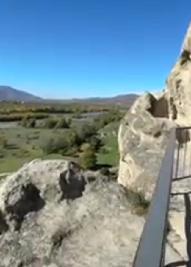 The video presents a high-angle view of a landscape featuring a river running through a green valley, framed by distant mountains under a clear blue sky. To the right of the frame is a large, rocky formation, possibly part of a cliff or mountainside, with a metal railing and a small, striped object (possibly a bench or trash can) situated on a stone platform extending from the rock. The strong wind sound is prominent, suggesting a windy day at the elevated location.