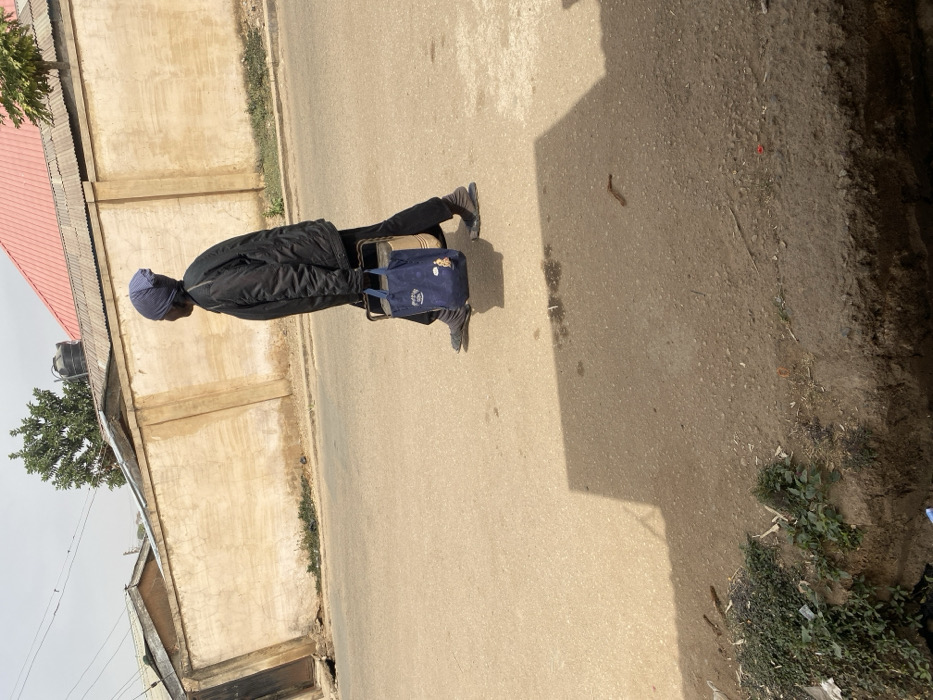 An adult individual is depicted walking from right to left across a light-colored asphalt road in a residential area of Jos, Nigeria. The person wears a dark blue beanie, a black puffer jacket, dark trousers, and dark sandals over grey socks. They carry a blue tote bag with a cartoon design, which is positioned in front of a larger, light brown rectangular container, both held in their left hand. The immediate foreground shows a dirt shoulder with sparse green vegetation and scattered debris. In the background, a long, high, beige-colored concrete wall parallels the road. Behind this wall, structures with a light-colored corrugated metal roof on the left and a prominent red corrugated metal roof on the right are visible. An elevated black water tank is situated above the wall between these structures. Green foliage from trees extends above the wall. The sky is a uniform light grey, indicating overcast or hazy conditions.