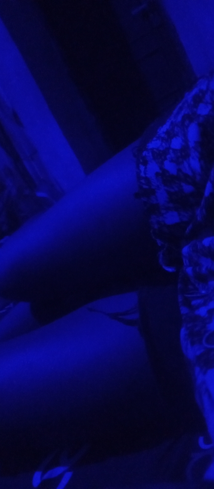 The scene depicts an interior setting in Abuja, Nigeria, illuminated predominantly by a deep blue light source, resulting in a low-contrast, monochromatic image. In the foreground, the bare legs of at least two individuals are visible, suggesting a seated or reclined posture. One leg occupies the central diagonal of the frame, extending from the upper left towards the lower right. A second leg is partially visible beneath and to the left of the prominent leg. To the right of the frame, a segment of patterned fabric, possibly clothing or a textile, displays bright blue floral or abstract designs against a darker blue background. The background remains dark and indistinct, showing faint architectural or furniture lines. No specific actions or interactions between individuals are discernible beyond their proximity. Indistinct light shapes at the very bottom edge may indicate footwear or other objects on a surface.