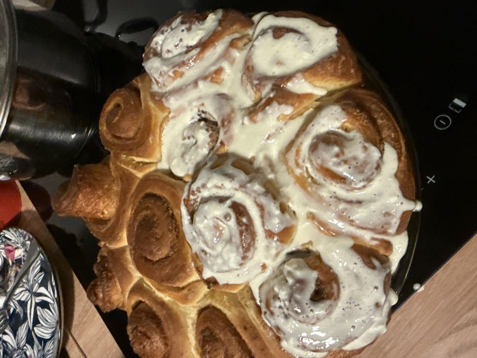 - "A cluster of freshly baked cinnamon rolls fills the frame, some generously topped with a creamy white glaze" by FM-o3Fqy2, licensed under CC BY 4.0