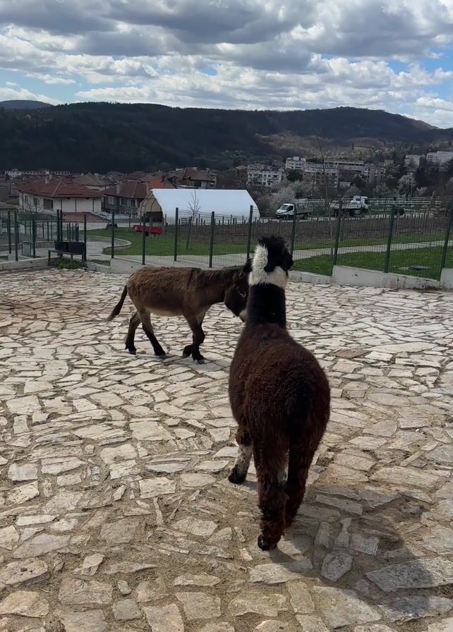 donkey and an alpaca on a cobblestone surface. The donkey is brown and walks towards the left of the frame, while the alpaca, which is mostly brown with a white and black neck, faces away from the camera. In the background, there is a fence, buildings, trees, and a hilly landscape under a cloudy sky. The scene appears to be an outdoor enclosure in a rural or suburban area.