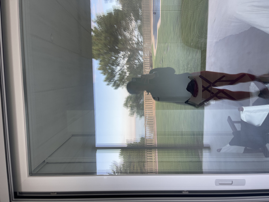 The image displays a reflection in a large glass sliding door or window, offering a dual view of an interior space and an exterior landscape in Vilar, Spain. A person is visible in the reflection, positioned centrally, holding a black smartphone to capture a selfie, thereby obscuring their face. This individual wears a dark long-sleeved top and reddish-orange leggings with a geometric pattern, and a black fanny pack with a red accent is worn across their chest. To the left, within the reflection, a white foldable chair with a dark frame is visible. To the right, part of a white object, possibly a bed or furniture, is reflected. The ceiling, featuring light-colored panels, is reflected in the upper section of the glass. Beyond the glass, the exterior view reveals a manicured green lawn. To the right of the lawn, a blue swimming pool is partially visible. A light-colored, possibly wooden, balustrade or fence runs horizontally across the mid-ground, separating the property from a distant view of the sea under a clear sky. Several trees, appearing evergreen, are scattered across the landscape, particularly prominent on the right side of the frame. The scene is illuminated by natural light, indicative of daytime.