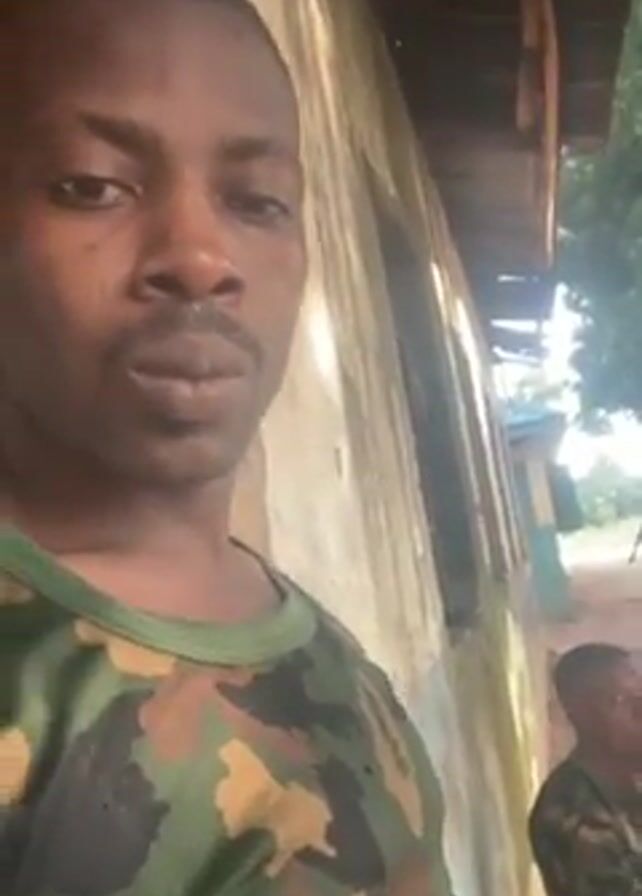 man in a camouflage shirt standing next to an old, weathered building. He is looking at the camera with a serious expression. Behind him, another man in a camouflage shirt is sitting on a motorcycle, talking into a microphone. In the background, a person is walking away from the camera on a dirt path. The environment appears to be outdoors, with trees visible in the background. The building has several windows, and the paint is peeling. The overall atmosphere is somewhat somber.