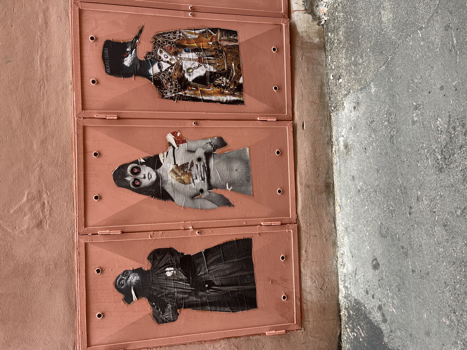 Three distinct collaged posters are affixed to three adjacent, vertically oriented, salmon-pink colored metal utility access panels embedded in a matching stucco wall