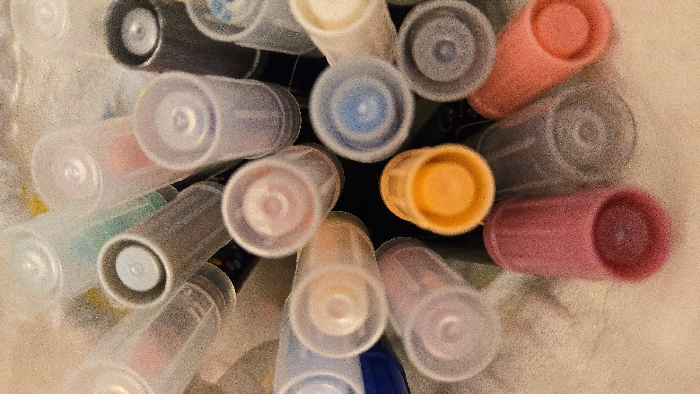 - "A high-angle overhead shot depicts a collection of approximately twenty-five writing instruments, identified as markers, arranged vertically in a clustered formation" by FM-0J88a2, licensed under CC BY 4.0