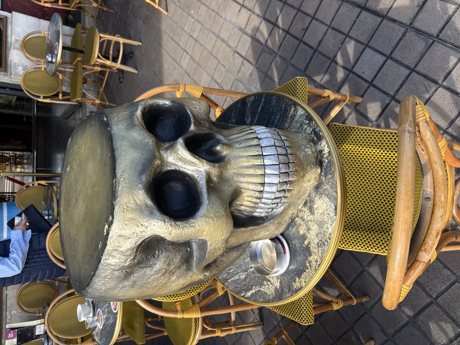 - "A large, gold-painted skull statue with dark eye sockets and prominent silver teeth rests centrally on a small, round outdoor cafe table in Bordeaux, France" by FM-qzRJ63, licensed under CC BY 4.0