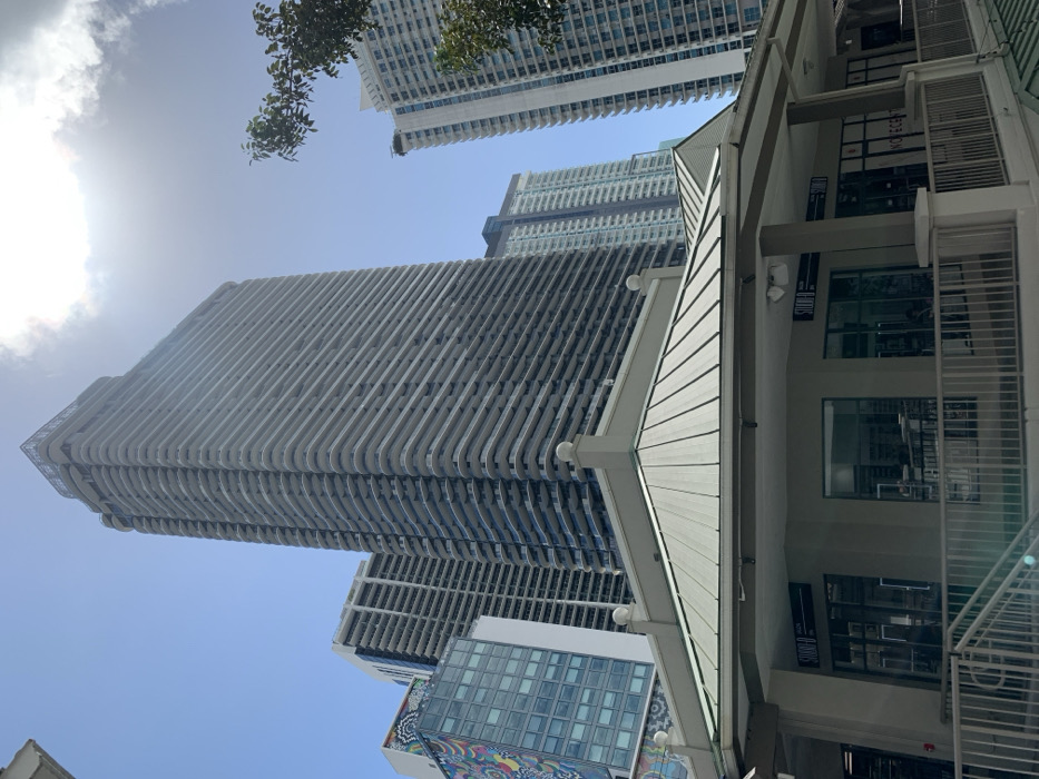 - "The image displays an upward-angled view of a dense urban environment in Downtown Miami, Florida, specifically near Bayside Marketplace and Biscayne Boulevard" by FM-DBi483, licensed under CC BY 4.0
