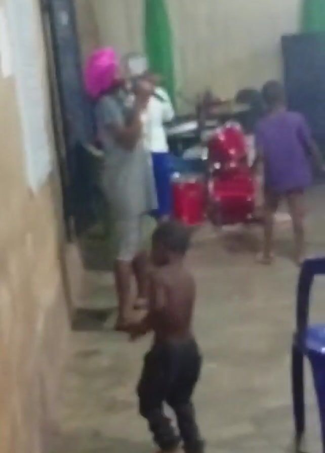 In a brightly lit indoor space, a woman with a pink headwrap sings into a microphone, surrounded by other people and musical instruments. A young, shirtless boy wearing dark pants and sandals dances enthusiastically in the foreground. Behind the singer, there's a set of red drums and a large black speaker. Blue plastic chairs are positioned to the right of the dancing boy, while green and pink drapes adorn the background. The room appears to be a multipurpose space, possibly a church or community hall.