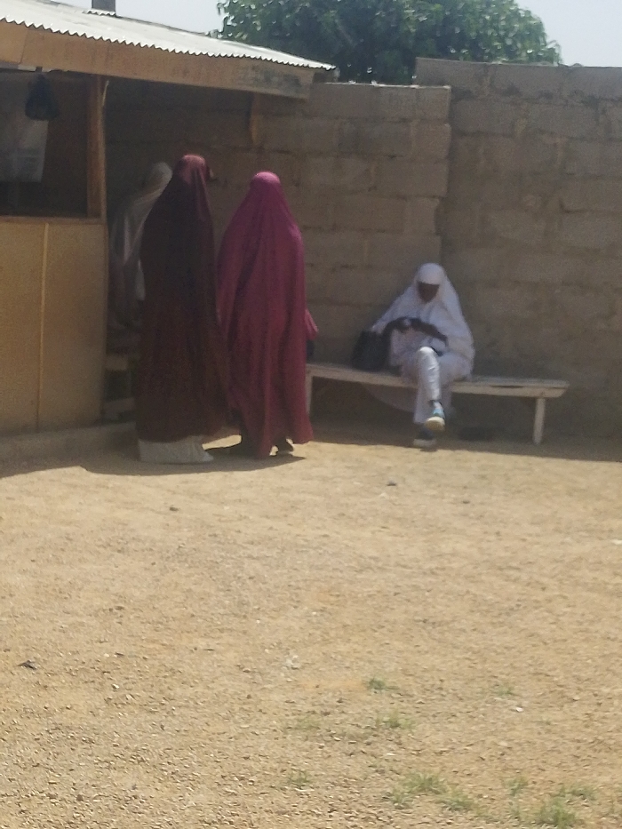 The scene depicts an outdoor, unpaved area in Babban Giji, Nigeria, characterized by light-brown dirt and gravel under direct sunlight