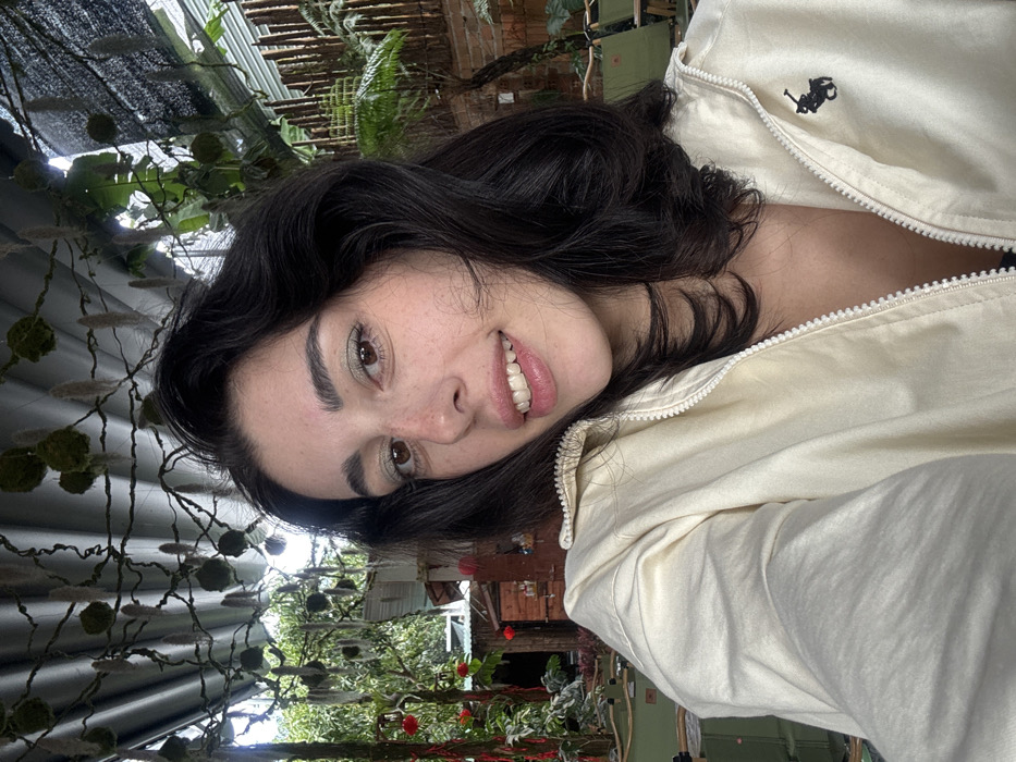 A brunette woman in a cream-colored jacket smiles toward the camera. She has fair skin, dark eyebrows, and light green eyeshadow. A Polo logo is visible on her jacket. The background suggests an indoor garden. A metal structure hangs with moss balls and plant life. Greenery and a building with red accents are seen through the hanging plants. The image is taken at an angle with the woman tilted to the right.
