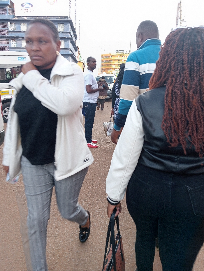 A group of people stroll along a street. A woman in a black shirt and white jacket walks towards the left, wearing grey pants and black shoes. A man in a blue and white striped shirt stands behind her, partially obscured by a woman with brown braided hair wearing a black and white jacket. Further back, a man in a white shirt and blue jeans is visible. The background shows buildings and vehicles, indicating an urban environment.