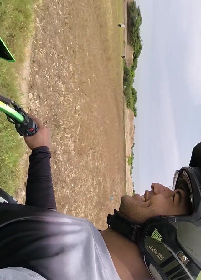 A person wearing a black and green motorcycle helmet is riding a green motorcycle across a dry, grassy field. The camera is positioned to show the person’s perspective. They are smiling and looking out at the field. The sky is cloudy. The motorcycle appears to be moving along a dirt track. There is another person in the distance in the field. The person riding the motorcycle is wearing a long-sleeved shirt and jeans.