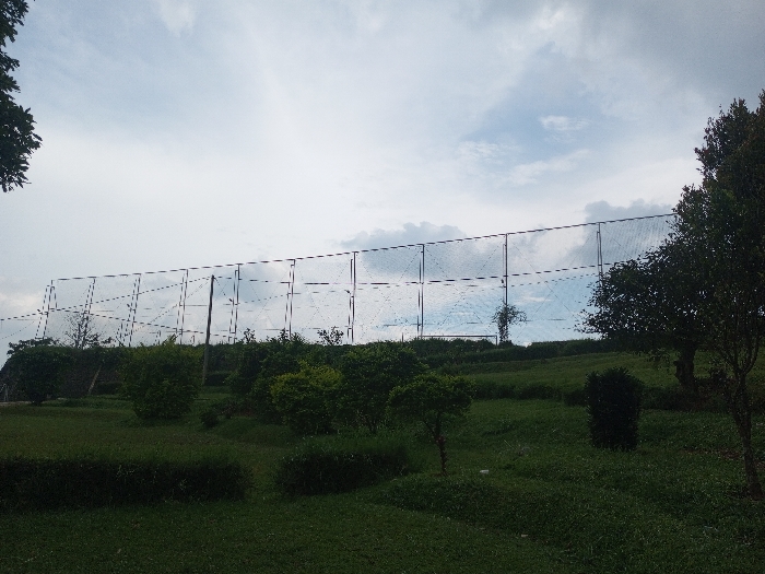 A grassy hillside landscape is framed by a high, transparent net fence. The green field, punctuated by shrubs and bushes, slopes upward towards the fence line. The sky above is overcast with patches of blue peeking through the clouds. Trees are present on either side of the frame, adding depth to the scene.