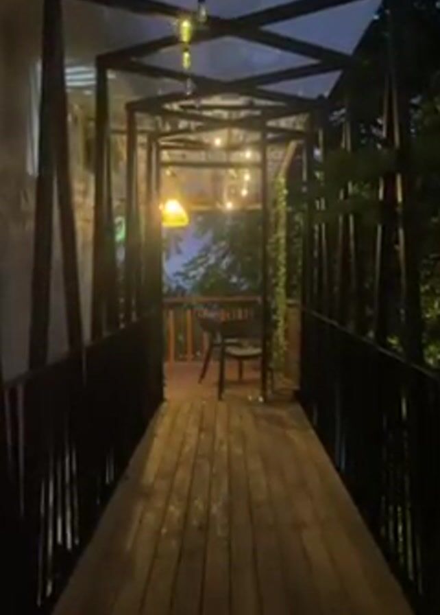 The video presents a view of a covered wooden walkway leading to an outdoor deck area. The walkway is constructed with a black metal frame forming a series of connected geometric shapes overhead, covered with a transparent material. String lights are hung within the frame, providing illumination. The sides of the walkway are bordered by black railings. The wooden planks of the walkway are slightly wet and reflect the ambient light. At the end of the walkway is a deck area with a wooden railing. A chair is positioned on the deck, facing outward, towards a view of trees and the twilight sky. The overall atmosphere is calm and serene, with soft lighting adding to the ambiance. Vegetation is visible to the sides, contributing to the outdoor setting.